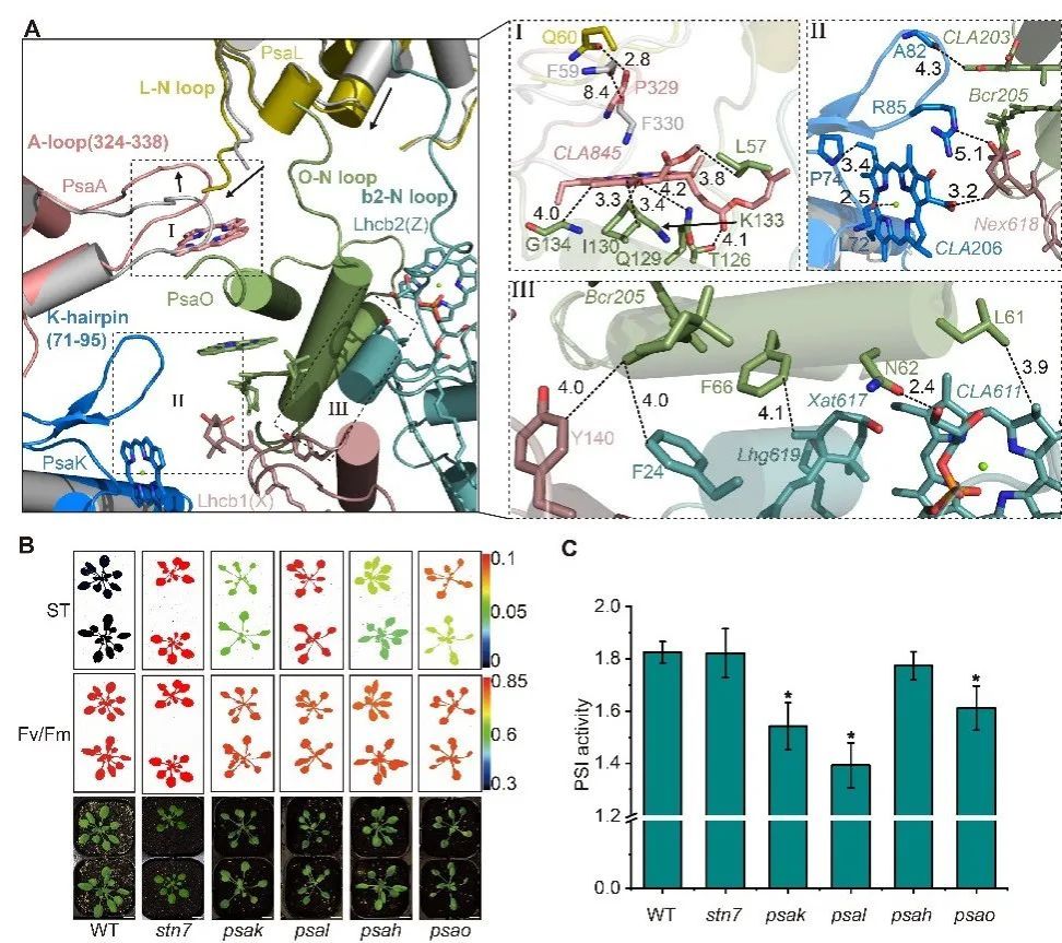 Fig. 2 状态转换过程中PsaA/PsaL/PsaK的构象变化增强PsaOLHCII的结合。A. 两种状态(ST2彩色,ST1灰色)下PsaA/PsaL/PsaKPsaO/Lhcb2/Lhcb1交界面残基的构象变化。B. 拟南芥突变体的叶绿素荧光分析。C. 拟南芥突变体的PSI活性分析。