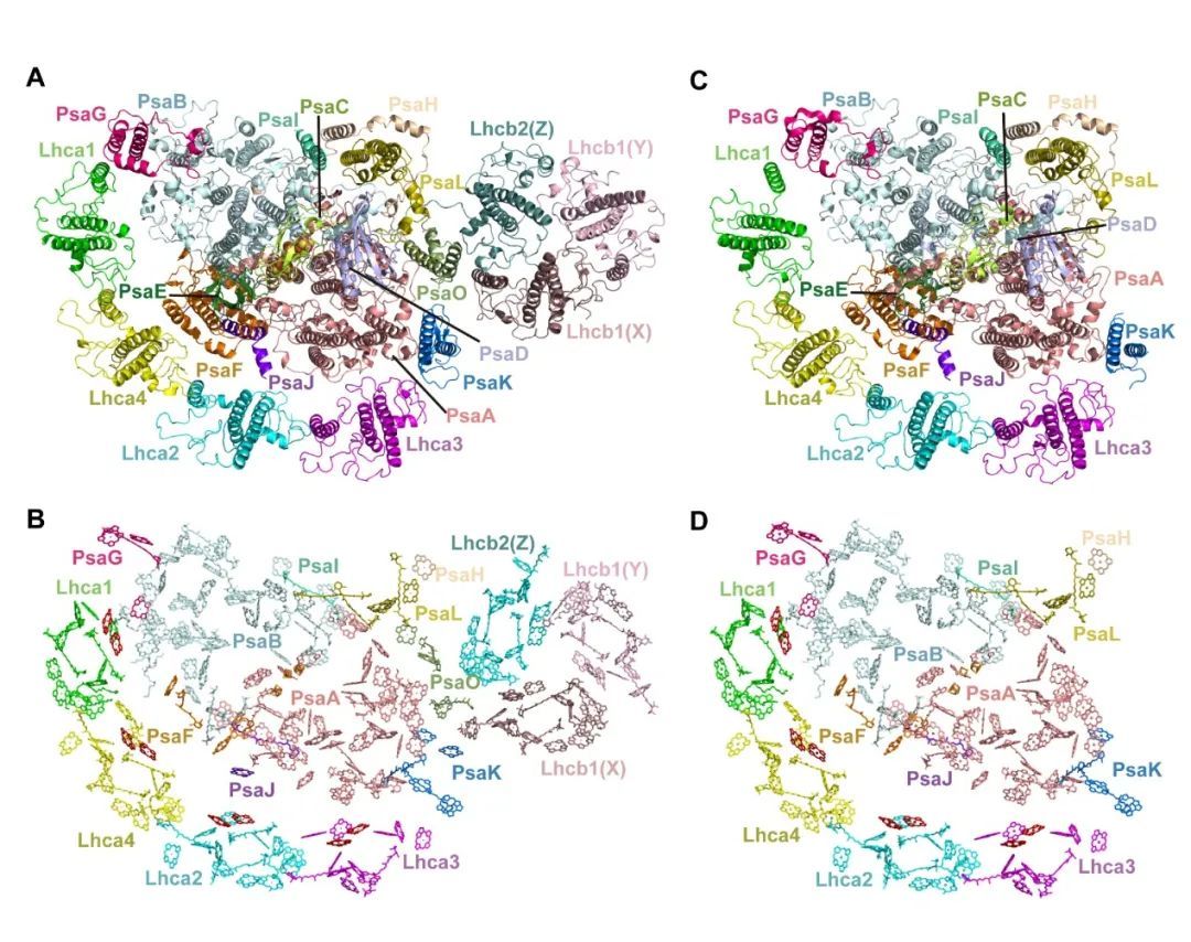Fig. 1 拟南芥PSI-LHCI-LHCII-ST2(左)和PSI-LHCI-ST1(右)复合物的总体结构
