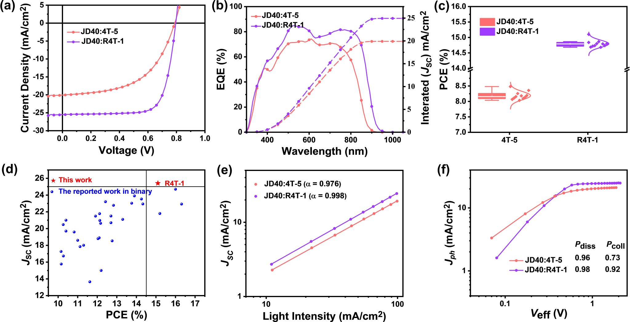 针对上述问题,研究团队提出了一种共价大环包裹的精准构筑策略,用于FNEAs材料的设计,合成了R4T-1受体分子。 单晶结构显示,共价包裹环可以完美地覆盖分子中心骨架,限制单键自由旋转、实现骨架的平面化、获得稳定的单一分子构象。本文所设计的简单四联噻吩(4T)的环包裹策略即可获得与复杂多元稠环在可见-近红外区域相当的吸收、紧密有序的分子堆积,最终实现光电转换效率突破15%的有机光伏器件。其中,器件的JSC达到了25.48 mA/cm2,为目前已报道的FNEAs材料中的最高值。“大环包裹”的分子设计策略不仅获得了性能优异的FNEAs材料,同时也为FNEAs深入而系统的研究提供了理想且精准的分子研究模型,更为重要的是该策略将会助力有机光伏材料的简单化、实用化,从而走向实际应用(Angew. Chem. Int. Ed.2023, e202316495)。