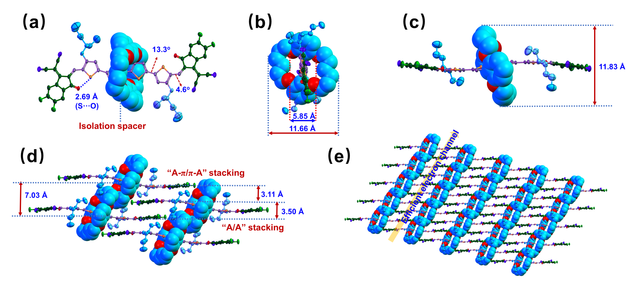 宋金生教授研究团队以寡聚噻吩为切入点,针对非稠环共轭长度、修饰基团等问题,通过单键相连构筑了三、四联噻吩骨架,报道了系列完全非稠环电子受体(FNEAs)(Adv. Funct. Mater.,2021,31, 2101742,J. Mater. Chem. A,2023,11, 7498-7504),其中4T-3分子展现了优异的光伏性能-成本效益品质因子。然而,其扭曲的分子骨架、多重的分子构象严重制约了分子间高效电荷通道的构筑,致使短路电流密度(JSC)较低。因此,消除单键自由旋转的固有属性、实现单一的分子构象是构筑有效电荷传输通道和发展高性能FNEAs的关键途径。