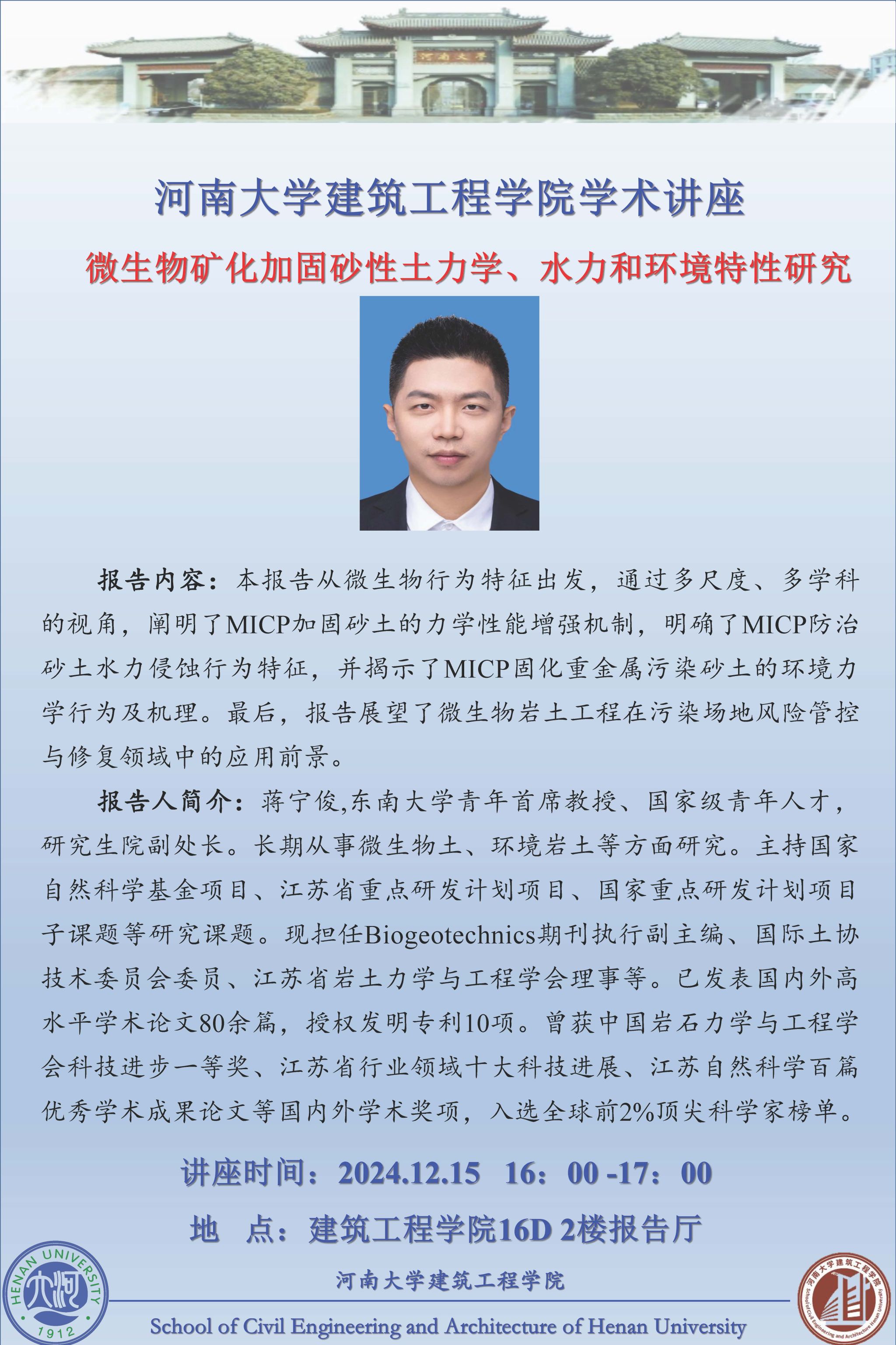 蒋宁俊:微生物矿化加固砂性土力学、水力和环境特性研究(时间:12月15日)