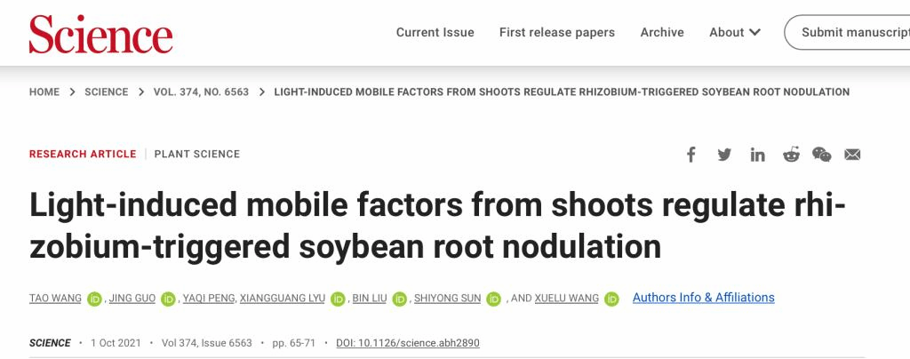 2021年10月1日,菲律宾欧博游戏官网作物逆境适应与改良国家重点实验室王学路团队在Science上发表了题为Light-induced mobile factors from shoots regulate rhizobium-triggered soybean root nodulation的研究论文,揭示了大豆中受光诱导表达的GmFTs(FLOWERING LOCUS T)和GmSTF3/4(orthologs of LONG HYPOCOTYL 5)从地上移动到地下,在根中被根瘤菌激活的共生信号关键组分CCaMK磷酸化激活,诱导根瘤形成的机制。