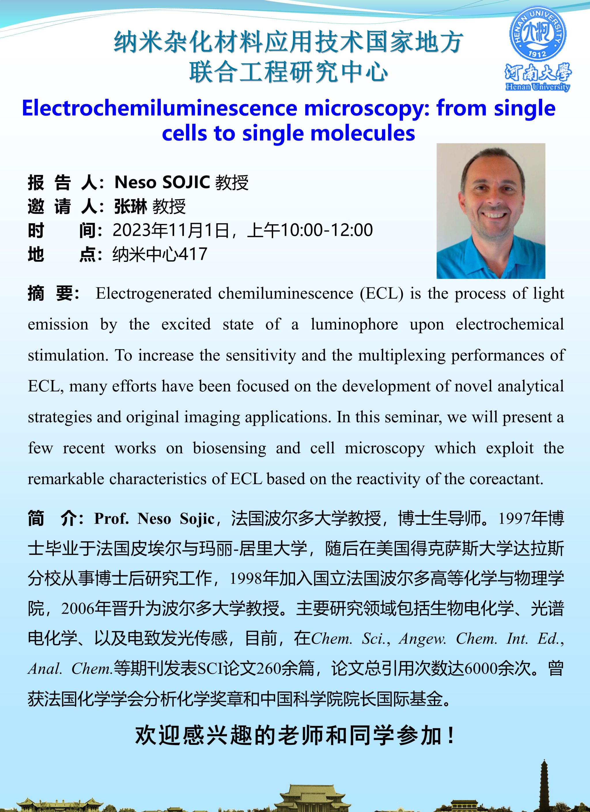 Neso SOJIC:Electrochemiluminescence microscopy: from single cells to single molecules(时间:11月1日)