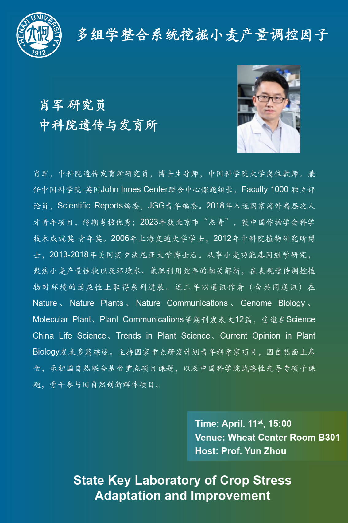 肖军:多组学整合系统挖掘小麦产量调控因子(时间:4月11日)